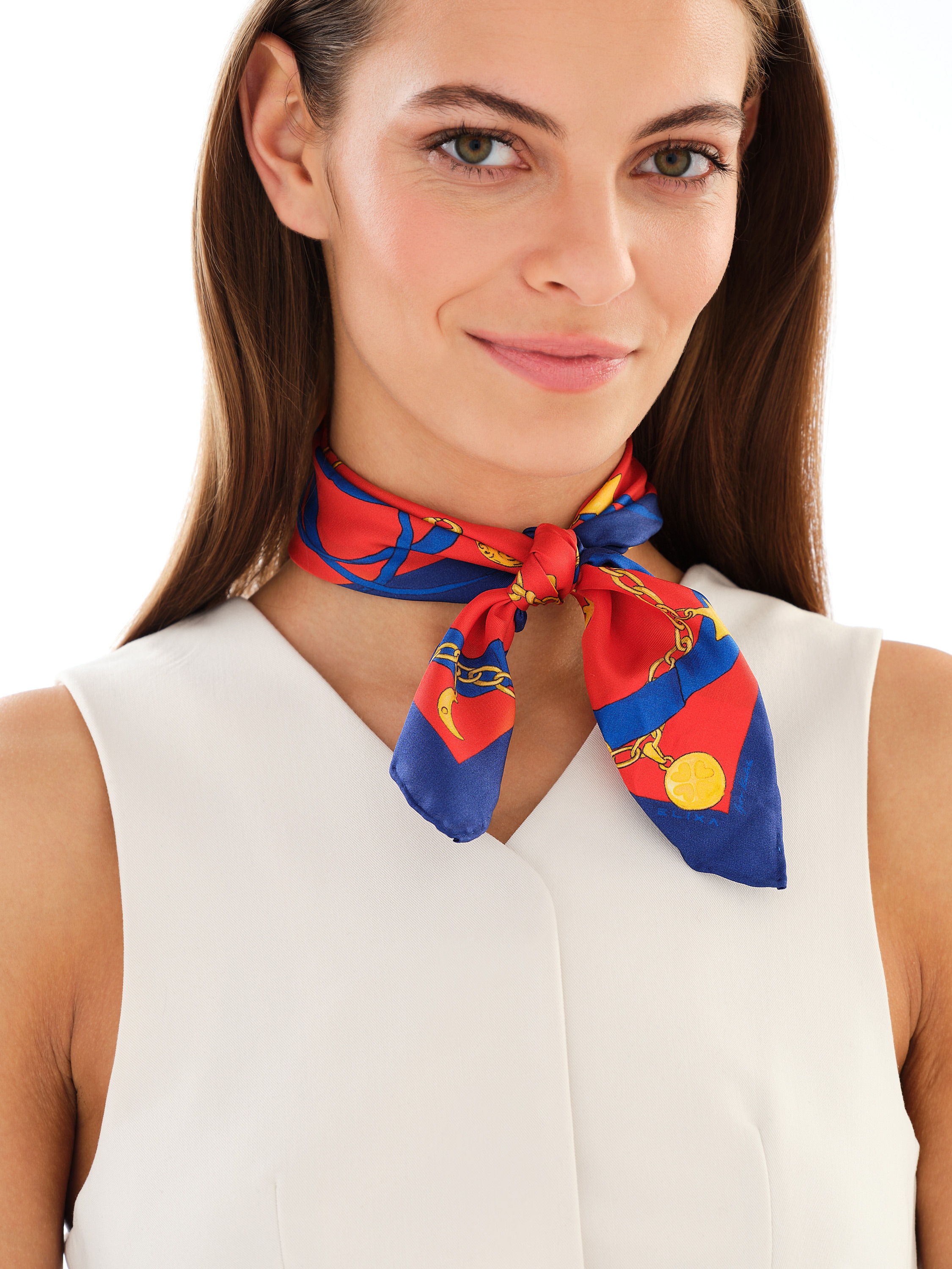 Harmonijne zestawienie czerwieni i granatu nadaje apaszce wyjątkowego charakteru.