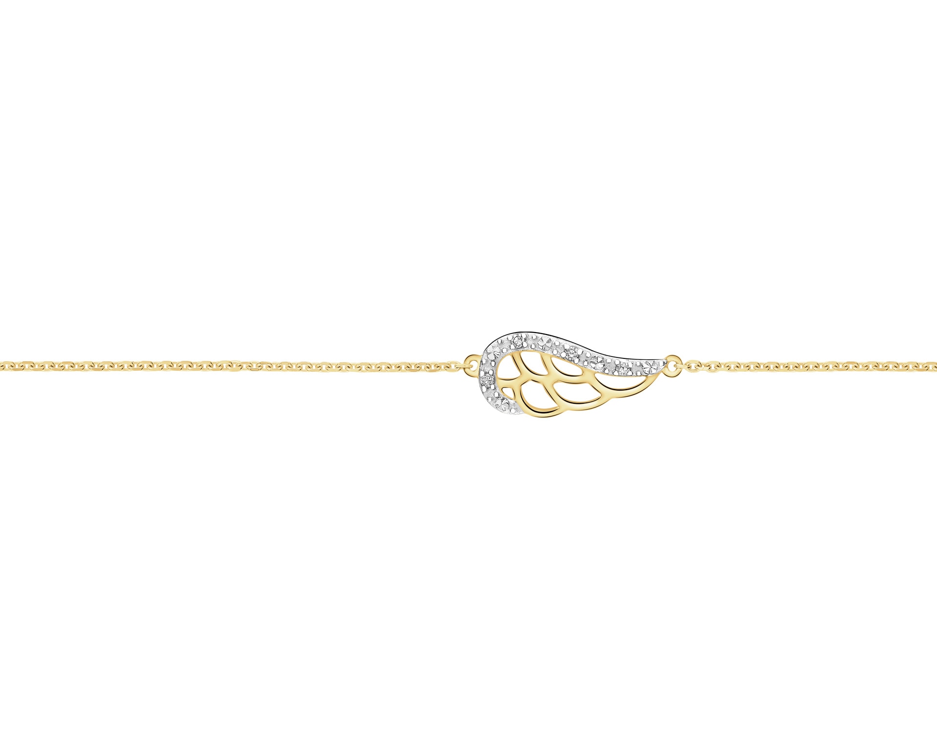 Pełna delikatności i diamentowego blasku bransoleta z żółtego złota. Ozdobiona zawieszką w kształcie skrzydła, dodatkowo lśni blaskiem czterech diamentów, które połyskują z niezwykłą intensywnością.