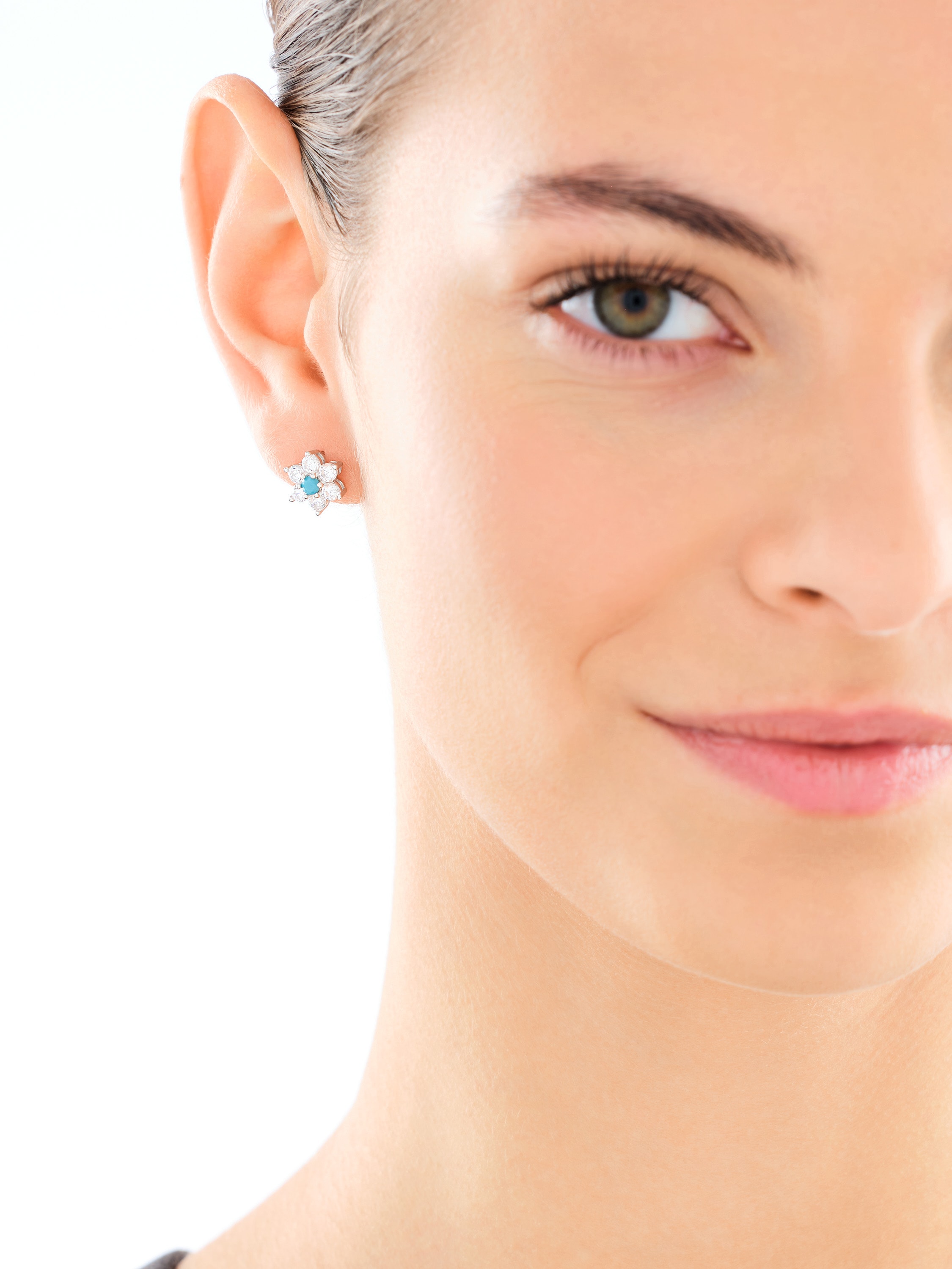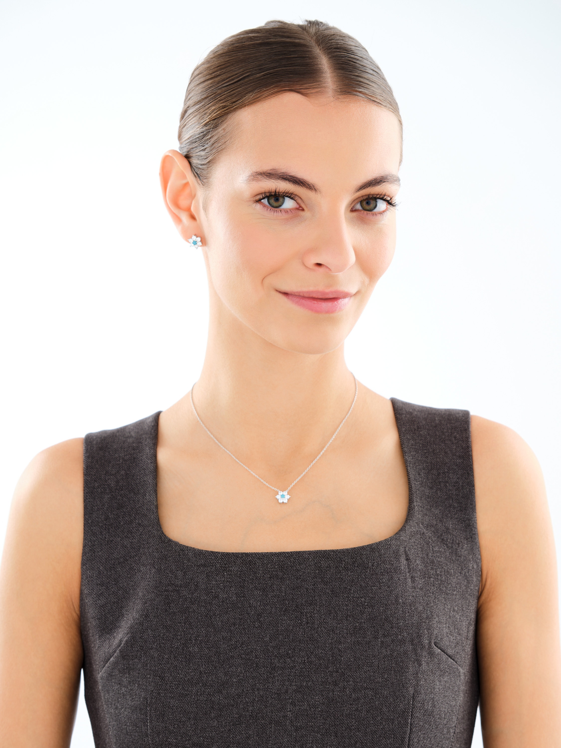 Naszyjnik srebrny z cyrkoniami i turkusem syntetycznym - kwiat