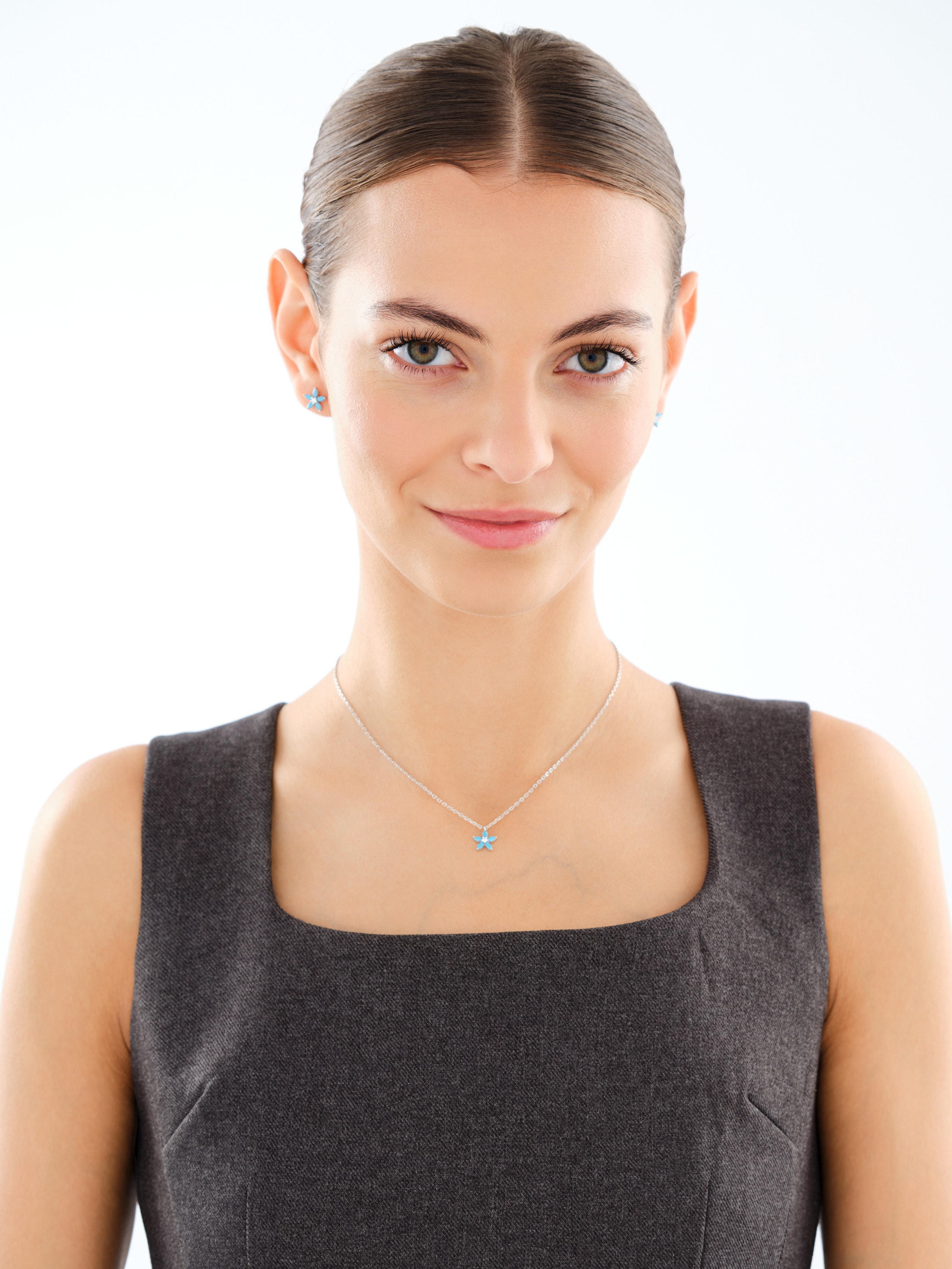 Naszyjnik srebrny z cyrkonią i turkusami syntetycznymi – kwiat