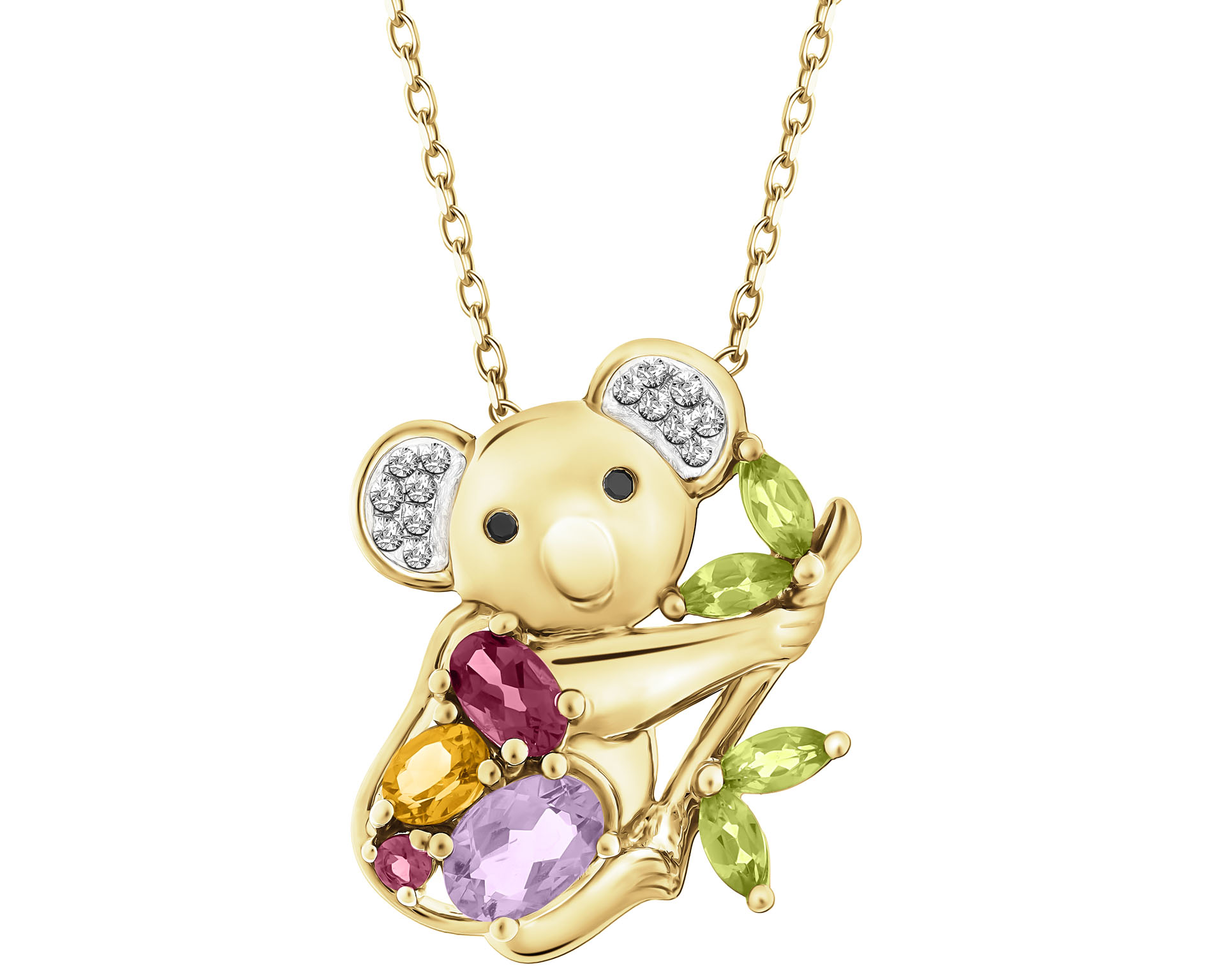 Naszyjnik z żółtego złota z diamentami, kamieniami szlachetnymi i ozdobnymi - miś koala - próba 585