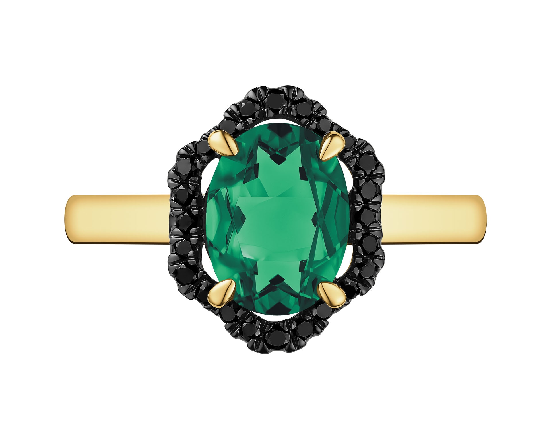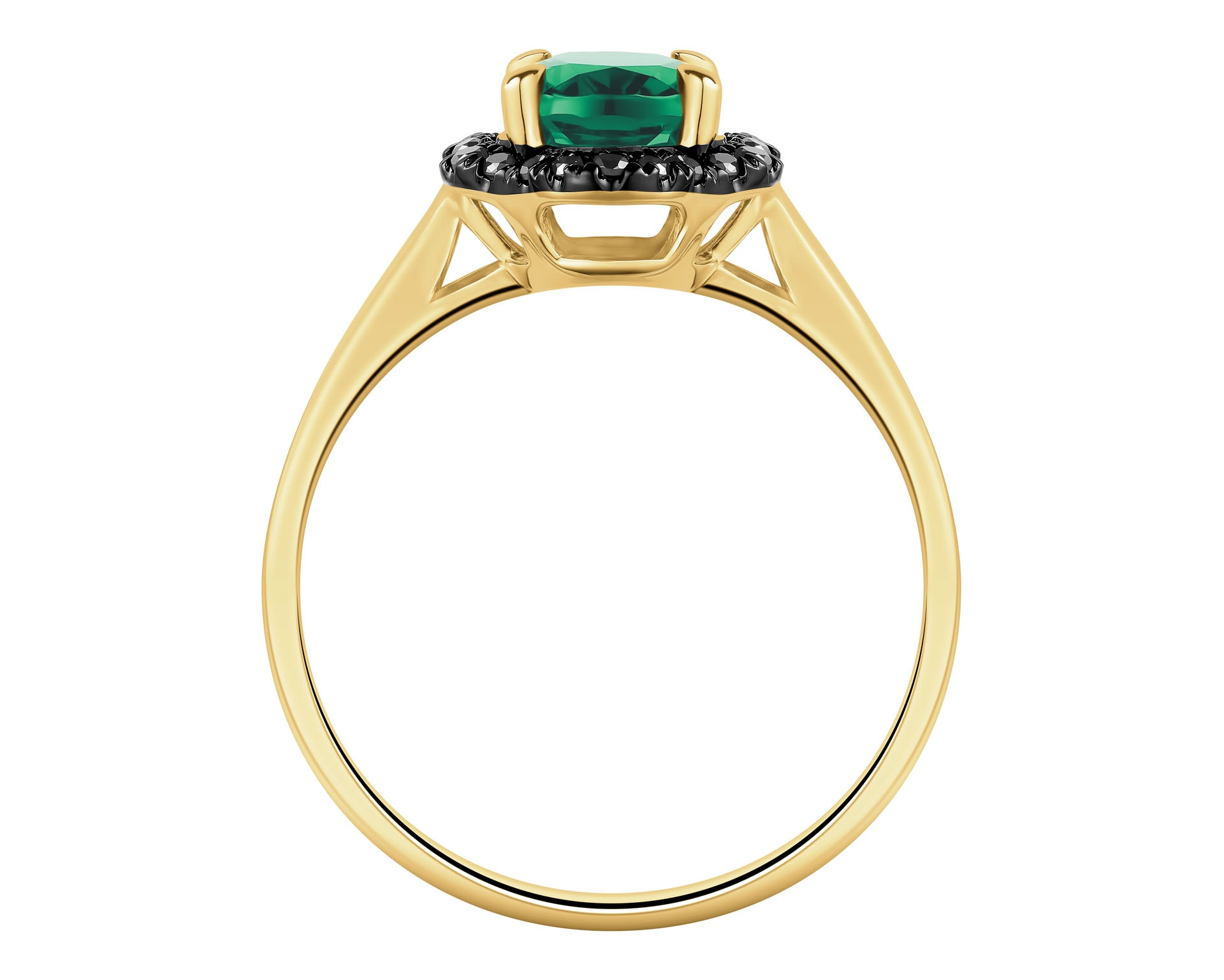 Pierścionek z żółtego złota z czarnymi brylantami i szmaragdem syntetycznym - próba 585