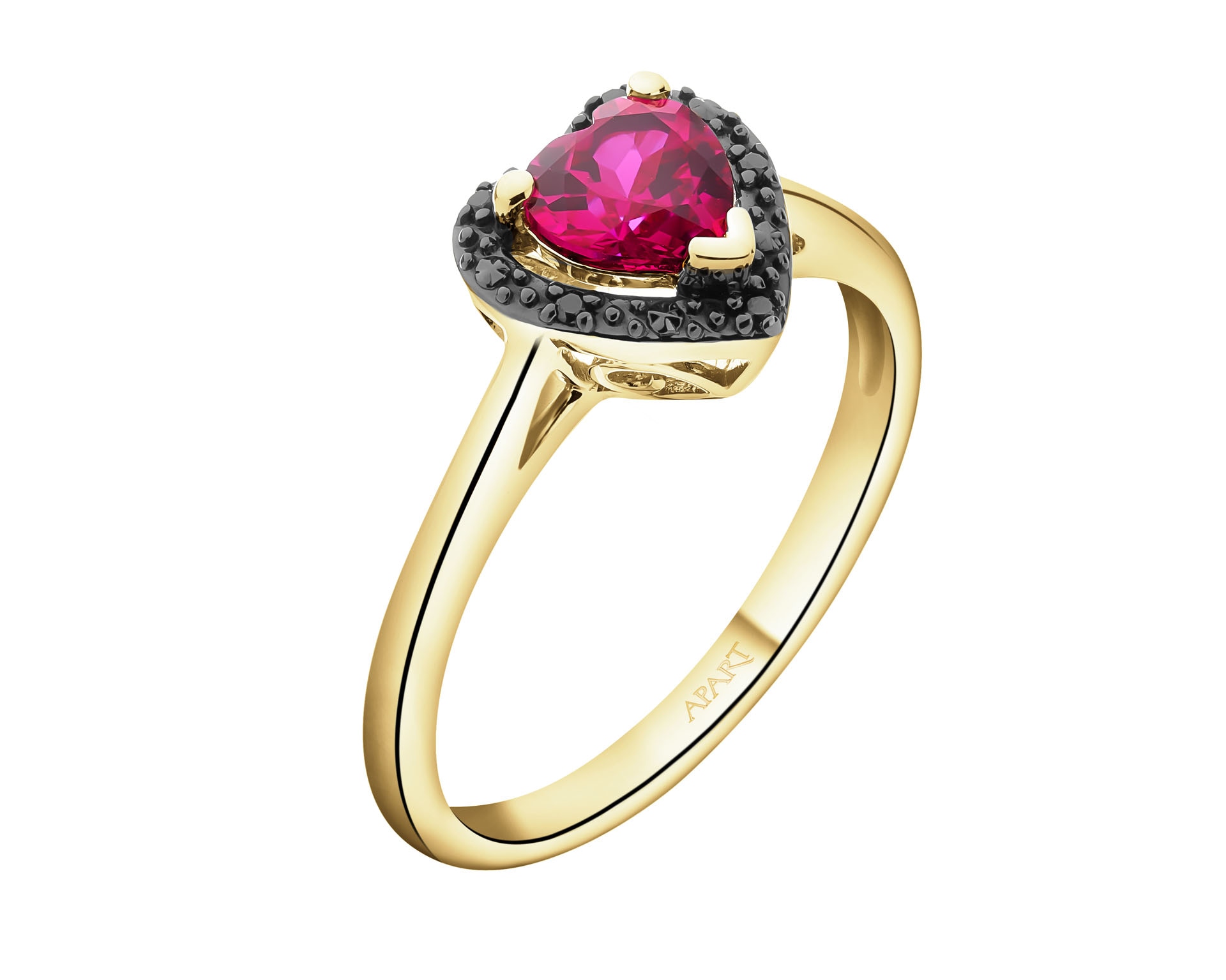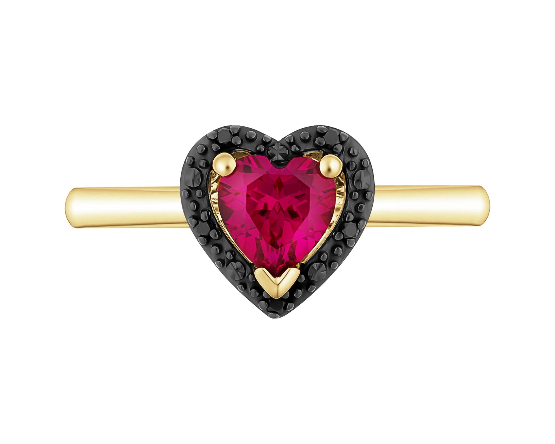 Pierścionek z żółtego złota z czarnymi diamentami i rubinem syntetycznym - serce - próba 375