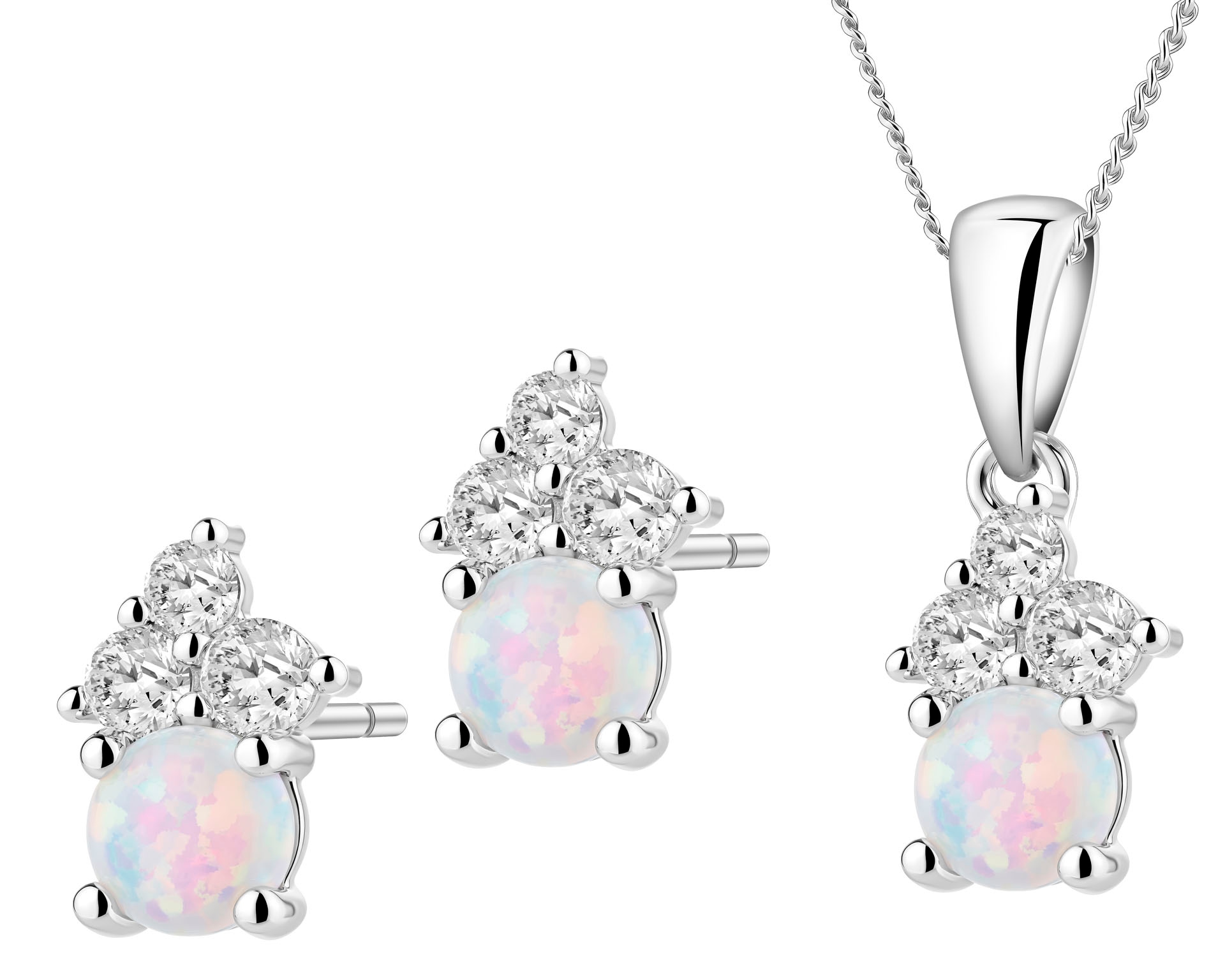 Srebrne kolczyki i zawieszka z cyrkoniami i opalem syntetycznym, łańcuszek - komplet