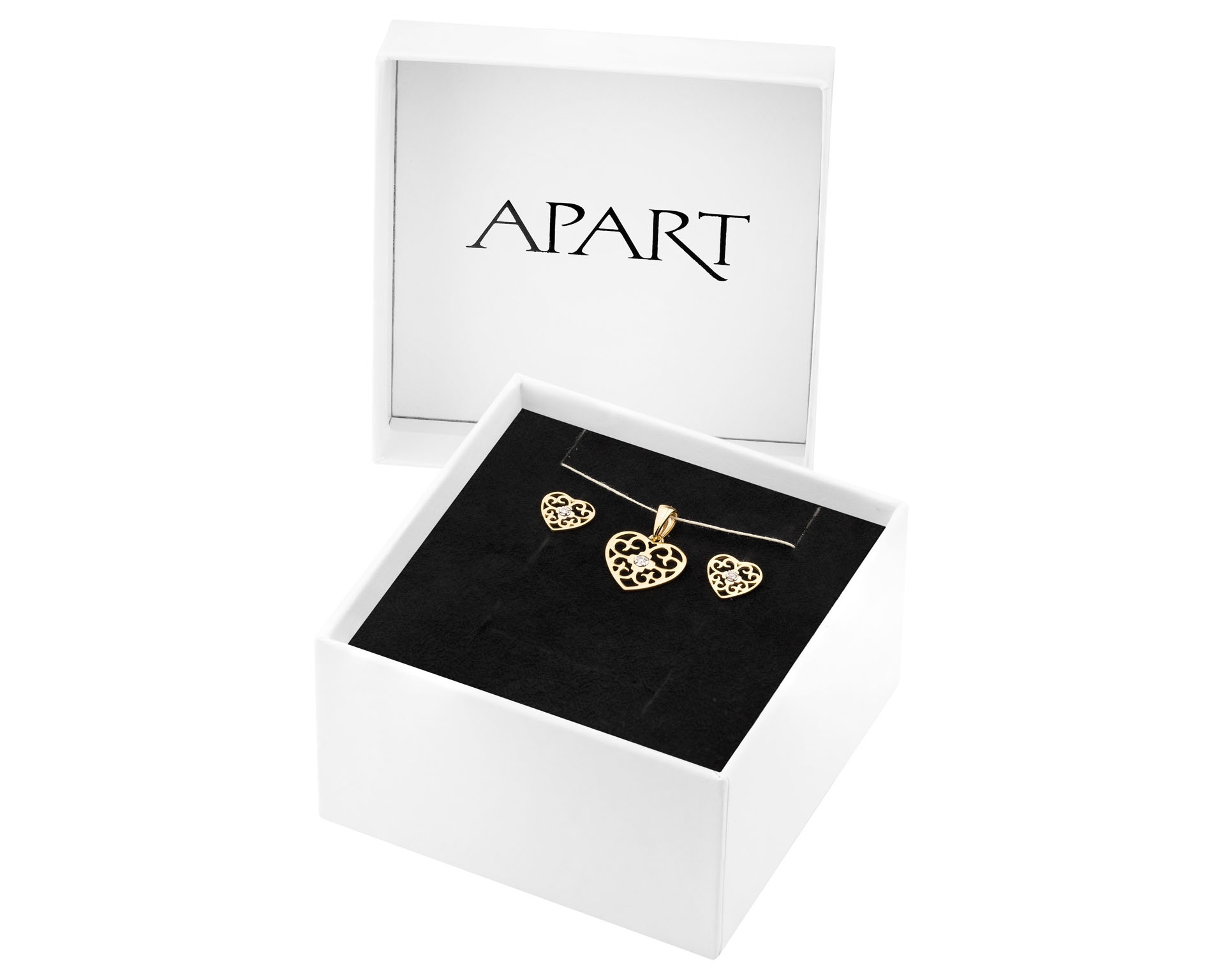 Zawieszka i kolczyki z żółtego złota z diamentami - komplet - serca - 0,01 ct - próba 375
