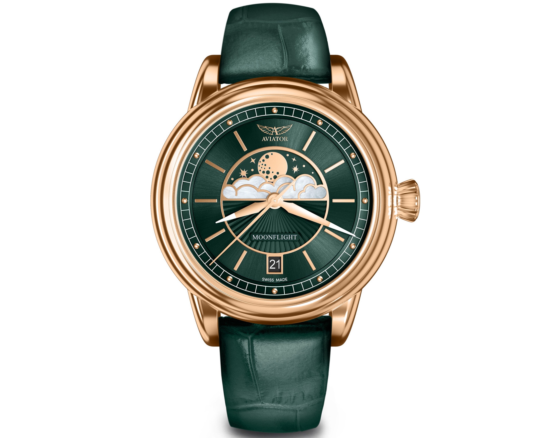 Aviator MoonFlight Diamond Edition przenosi nas do złotej ery lotnictwa i mody Art Déco. Inspirowany nocnymi lotami legendarnego Douglasa DC-3, łączy blask diamentów z romantyzmem księżycowego światła. Tarcza z masy perłowej, ozdobiona fazami księżyca i diamentowymi indeksami, zachwyca subtelnym połyskiem i głębią detali.