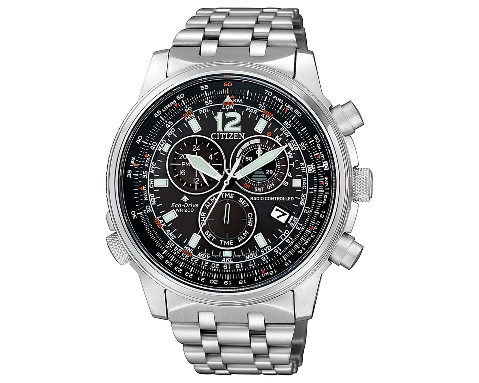 Cechy: chronograf, datownik, wskazówkowy, Eco-Drive, Radio Controlled, alarm, sekundnik, stoper, suwak logarytmiczny, wieczny kalendarz, wskaźnik 24-godzinny