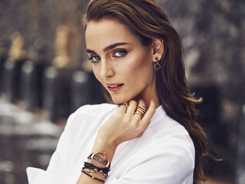 Model z linii Finesse powstał z myślą o kobietach poszukujących nietuzinowych dodatków. Kolorystyka zegarka utrzymana w tonacjach przypominających modne, różowe złoto i czerń w niewymuszony sposób dopełnia intrygujący fason. Dużą, okrągłą kopertę zestawiono z oryginalnym paskiem ze skóry naturalnej, którego długość pozwala na dwukrotne owinięcie wokół nadgarstka. Interesującym rozwiązaniem jest dołączona do zestawu bransoleta w tej samej stylistyce. Równie ciekawa jest tarcza – poziome pasy po bokach natomiast środek gładki w odcieniach brązu. Będzie atrakcyjnym akcentem zarówno fantazyjnych, jak i casualowych stylizacji. Wysokiej klasy kwarcowy mechanizm gwarantuje dokładność wskazań.