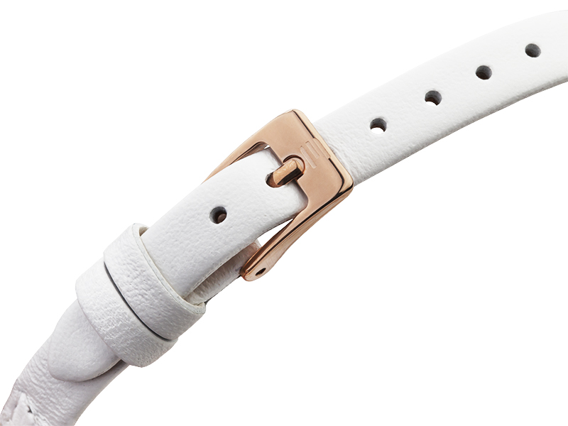 Chłodną biel zegarka z linii Finesse uzupełniono ciepłym odcieniem przypominającym różowe złoto. Takie zestawienie kolorystyczne jest niezwykle atrakcyjne i modne. Nowoczesny, minimalistyczny fason modelu także przyciąga uwagę interesującymi akcentami. Okrągłą, dużą kopertę zestawiono z nietypowym paskiem ze skóry naturalnej, który dwukrotnie oplata nadgarstek. Całość dopełnia gładka, jasna tarcza opatrzona logotypem. Zakładając go zarówno do casualowej, jak i swobodniejszej, letniej stylizacji podkreślisz swój wysublimowany gust. Uniwersalna barwa będzie współgrała z każdą tonacją twojej garderoby. W połączeniu z biżuterią ze złota o delikatnych kształtach stworzy idealny zestaw ulubionych dodatków na wiele okazji. Precyzję wskazań zapewnia wysokiej klasy kwarcowy mechanizm.