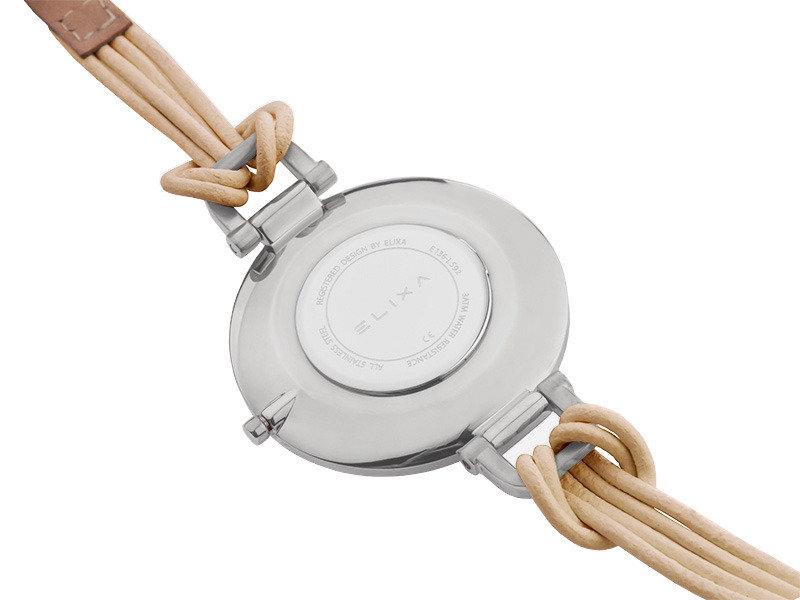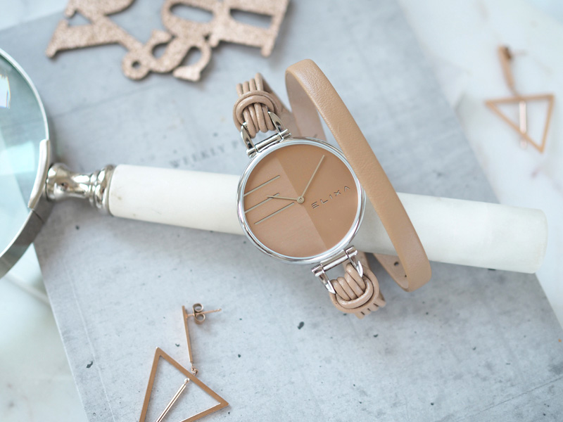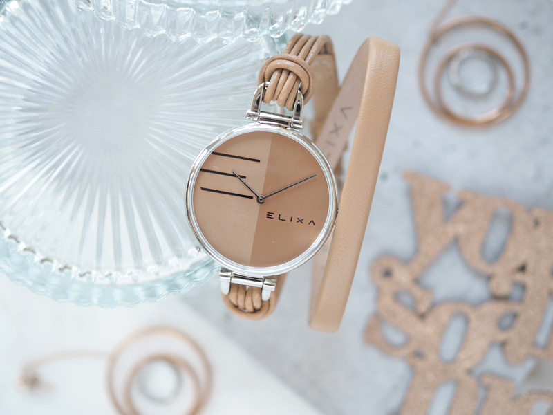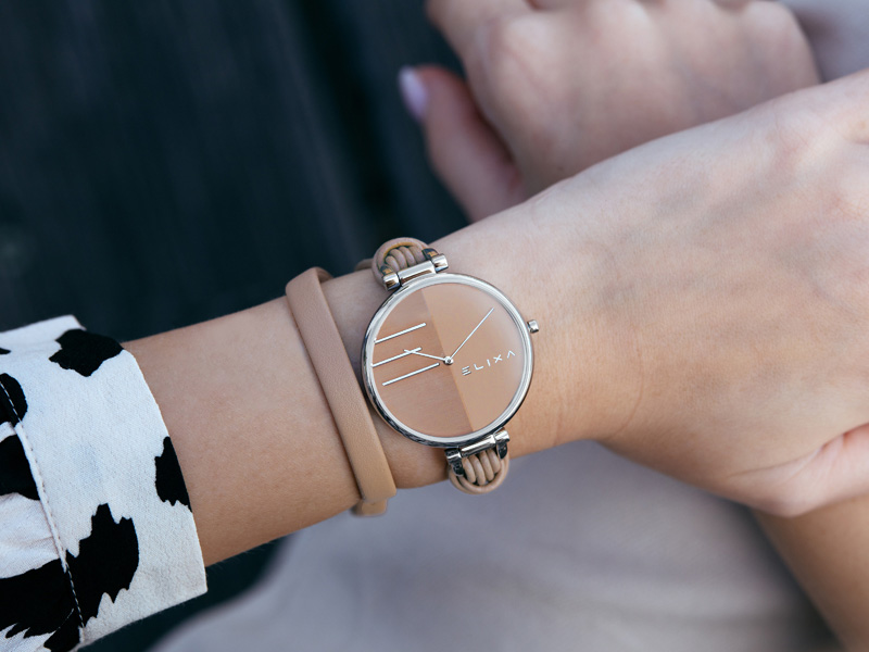 Elixa słynie z niezwykle designerskich projektów, które zachwycają zarówno formą, jak i starannością wykonania. Doskonałym przykładem jest model z linii Finesse w beżowej tonacji. Dużą, okrągłą kopertę zestawiono z nietypowym paskiem, który dwukrotnie oplata nadgarstek. Natomiast minimalistyczną tarczę zdobi logotyp oraz nazwa marki. Całość prezentuje się modnie i interesująco. Będzie doskonałym dodatkiem do casualowych stylizacji w odcieniach szarości. Biel, czerń czy „kolory ziemi” także komponują się z kolorystyką zegarka. Pasującą do niego biżuterią będzie srebrna lub ze stali o subtelnych kształtach. Precyzję odmierzania czasu zapewnia wysokiej klasy kwarcowy mechanizm.