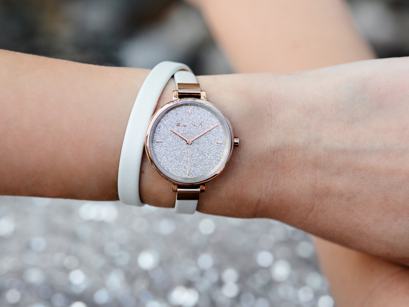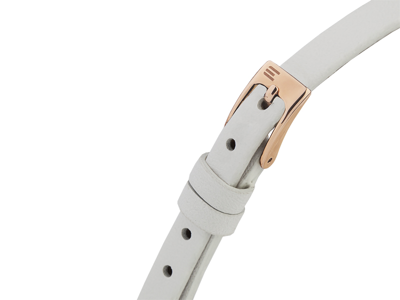 Jasną kolorystykę modelu z linii Finesse kontruje ciepły odcień przypominający modne różowe złoto. Minimalistyczną, okrągłą kopertę zestawiono z gładkim paskiem ze skóry naturalnej o niespotykanej długości, która pozwala na dwukrotne owinięcie go wokół nadgarstka. Na uwagę zasługuje tarcza, która przepięknie mieni się pod wpływem światła. Całość prezentuje się zjawiskowo i nowocześnie. Będzie interesującym akcentem zarówno casualowej, jak i stylizacji glamour. Łącz go także w indywidualne zestawy z biżuterią ze złota z kamieniami. Wysokiej klasy kwarcowy mechanizm zapewnia dokładność wskazań.
