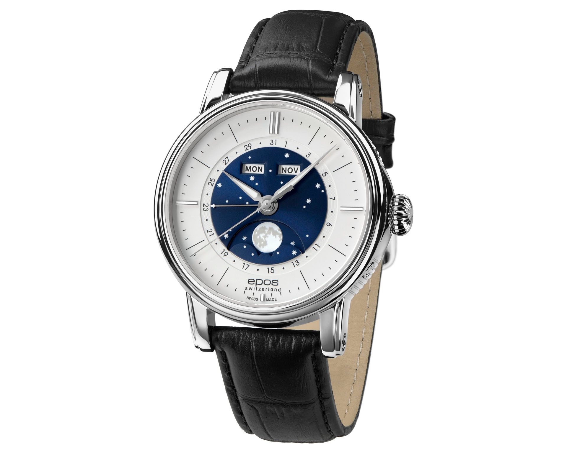 Cechy: datownik, wskazówkowy, sekundnik, wskaźnik dnia tygodnia, wskaźnik faz Księżyca, wskaźnik miesiąca
