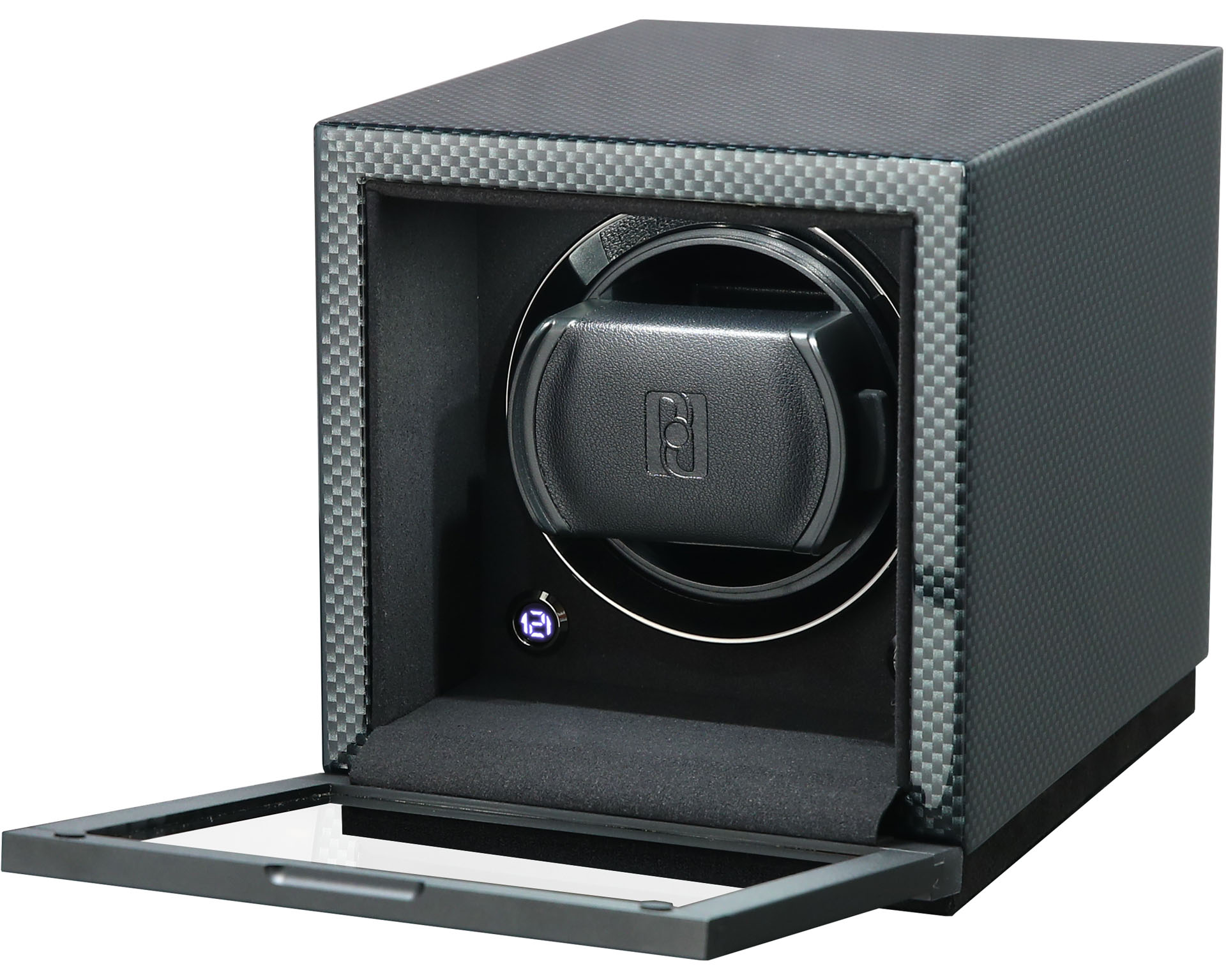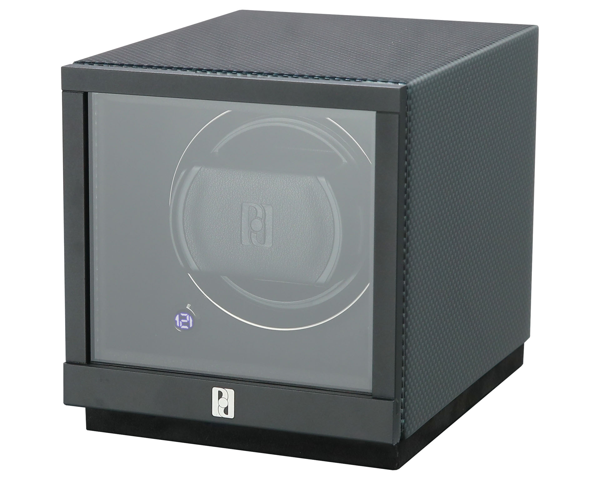 Rotomat o wymiarach 132x142x174 mm, przeznaczony dla jednego zegarka. Wykonany z drewna lakierowanego na wysoki połysk.