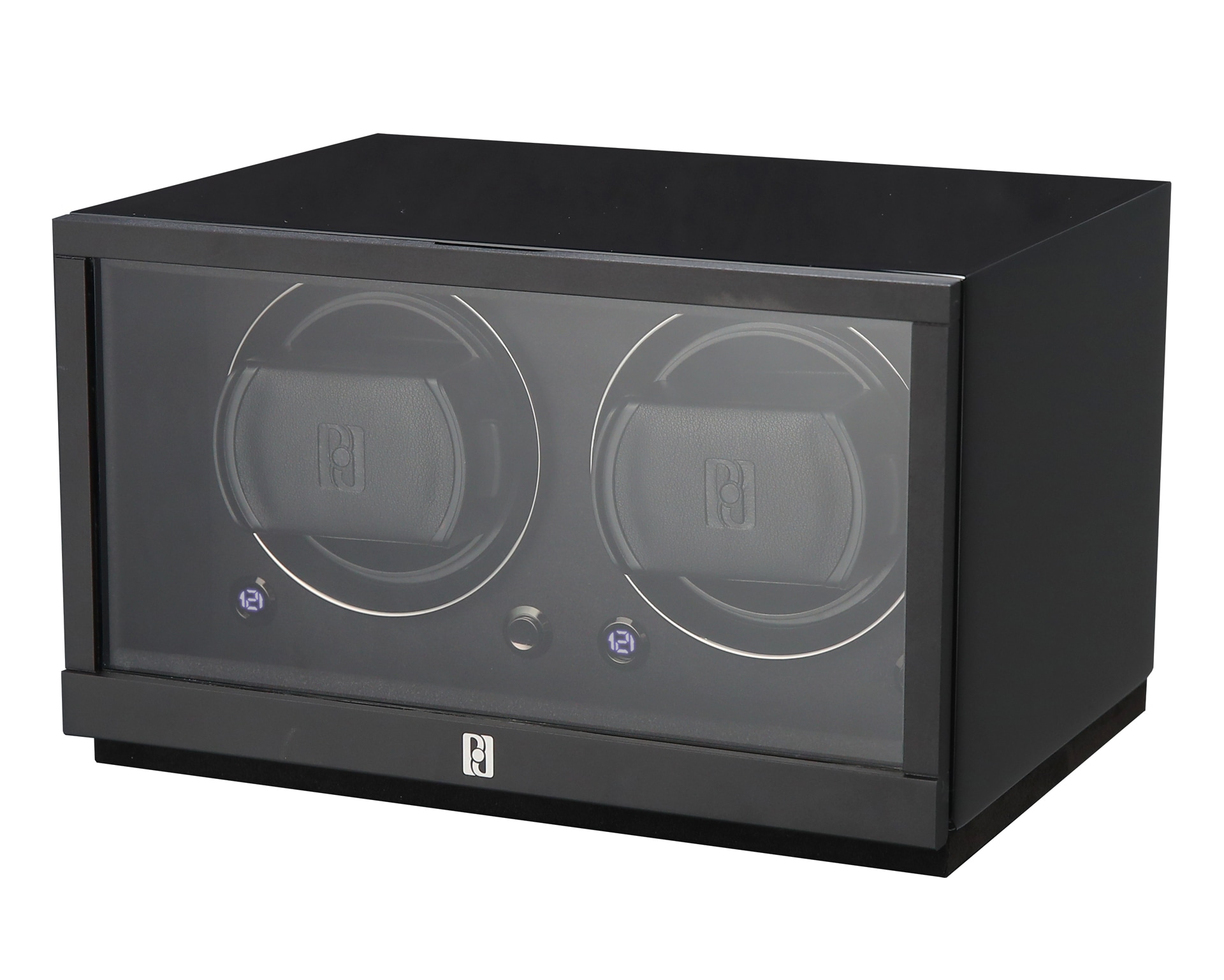 Rotomat o wymiarach 235 x 143 x 175 mm, przeznaczony dla dwóch zegarków, wykonany ręcznie z drewna lakierowanego na wysoki połysk.