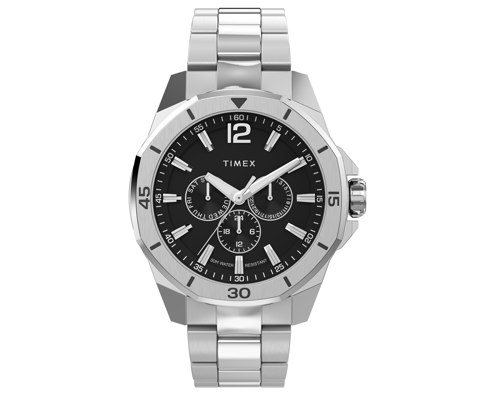 Cechy: datownik, wskazówkowy, sekundnik, wskaźnik 24-godzinny, wskaźnik dnia tygodnia