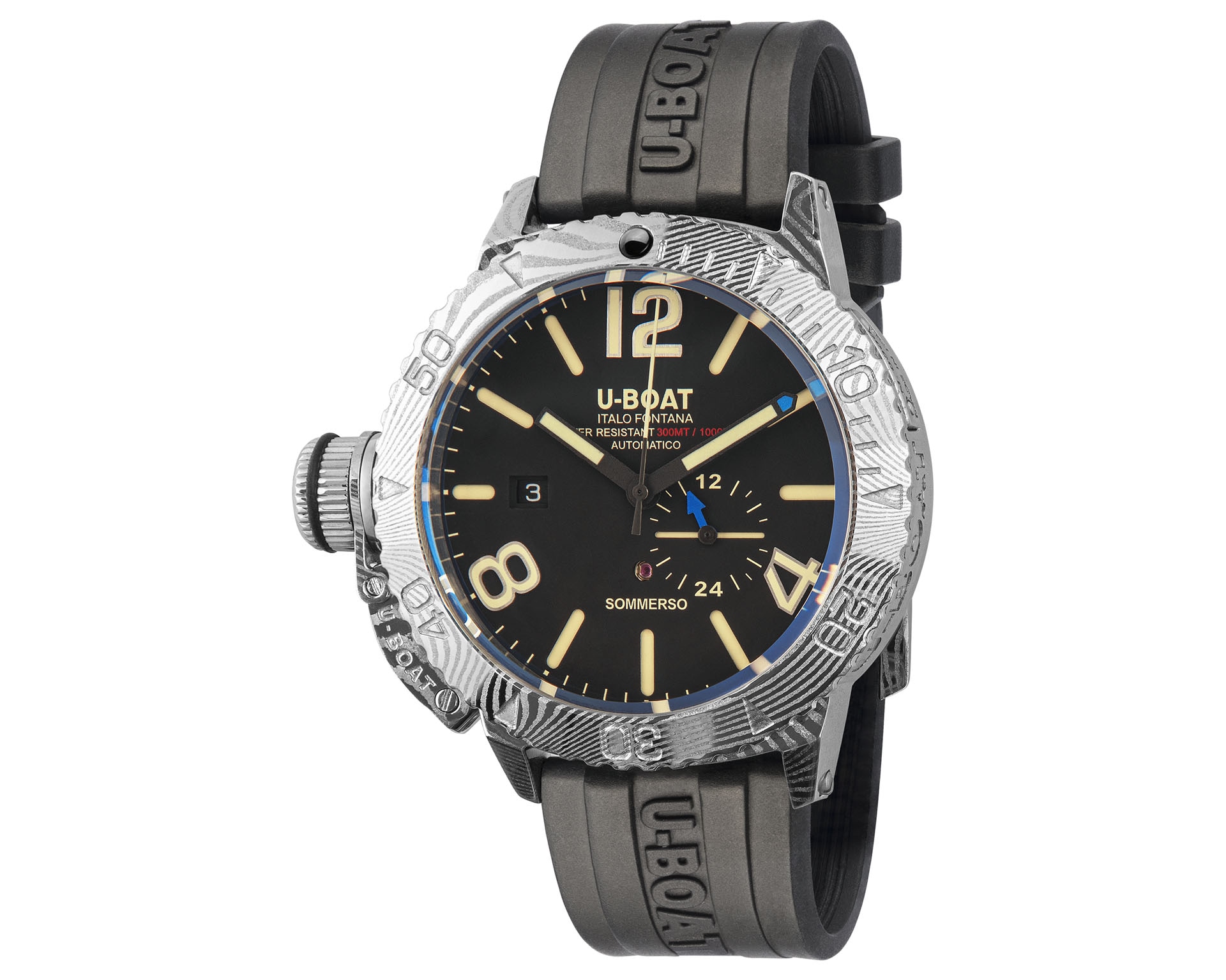 U-BOAT Sommerso: Limitowane, profesjonalne zegarki nurkowe z kopertą 46 mm w stali lub damasceńskiej stali i obrotowym bezelem po obu stronach. Automatyczny mechanizm Sellita SW 200, 41‑godzinna rezerwa chodu i trójpoziomowa tarcza z Super-LumiNova gwarantują precyzję i czytelność. Wodoszczelność 300 m, wytrzymały pasek z gumy lub skóry i charakterystyczny, techniczny design tworzą wyjątkowy czasomierz w limitowanej edycji.